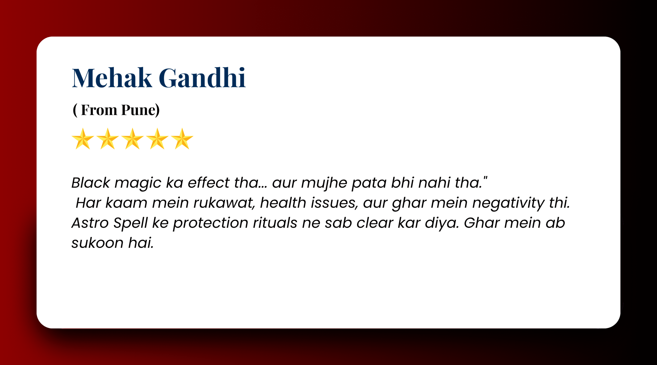 Astro Spell offers expert spiritual guidance to help protect against negative energies and unseen influences. Our authentic Vedic remedies focus on cleansing, protection, and restoring peace, positivity, and balance in life.